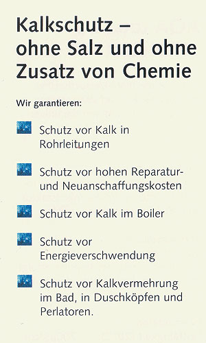 Ein Leben wie aus dem Bilderbuch. Sanft gleitet das Wasser über die Haut. Und bei Spülmaschine und Waschmaschine - nie mehr Kalkprobleme! Nicht nur das, zusätzlich bewahren Sie die Hausinstallationen vor Verkalkung und letztlich vor dem Rohrinfarkt.