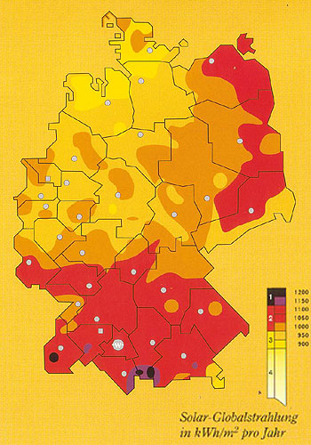 In Abhängigkeit der geographischen Lage beträgt in der Bundesrepublik Deutschland die jährliche Sonnenscheindauer etwa 1300 bis 2000 Stunden/Jahr.
