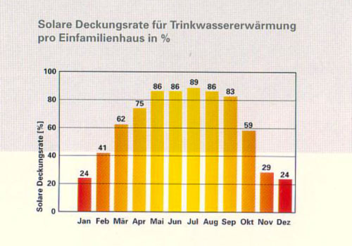 Zur Beurteilung der Effizienz eines Solarsystems ist die solare Deckungsrate sinnvoll, also der Anteil der Energieversorgung für die Trinkwassererwärmung, den die Solaranlage im Jahresdurchschnitt abdeckt. Das sind bei einem durchschnittlichen Ein- oder Zweifamilienhaus bis zu 60%.In den Monaten Mai bis August reicht die Energie in der Regel sogar aus, um die Trinkwassererwärmung nahezu vollständig abzudecken.