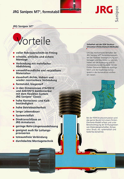 JRG Sanipex MT® das neue formstabile Vollkunststoff-Installationssystem von JRG besteht aus Mehrschicht-Verbundrohren und dem neuartigen kompletten Hightech-Fittingprogramm. Um den unterschiedlichen Anforderungen (Qualität, mechanischen Beanspruchungen) gerecht zu werden sind diese in einem neuentwickelten 2-Schicht-Kunststoffspritzverfahren hergestellt.